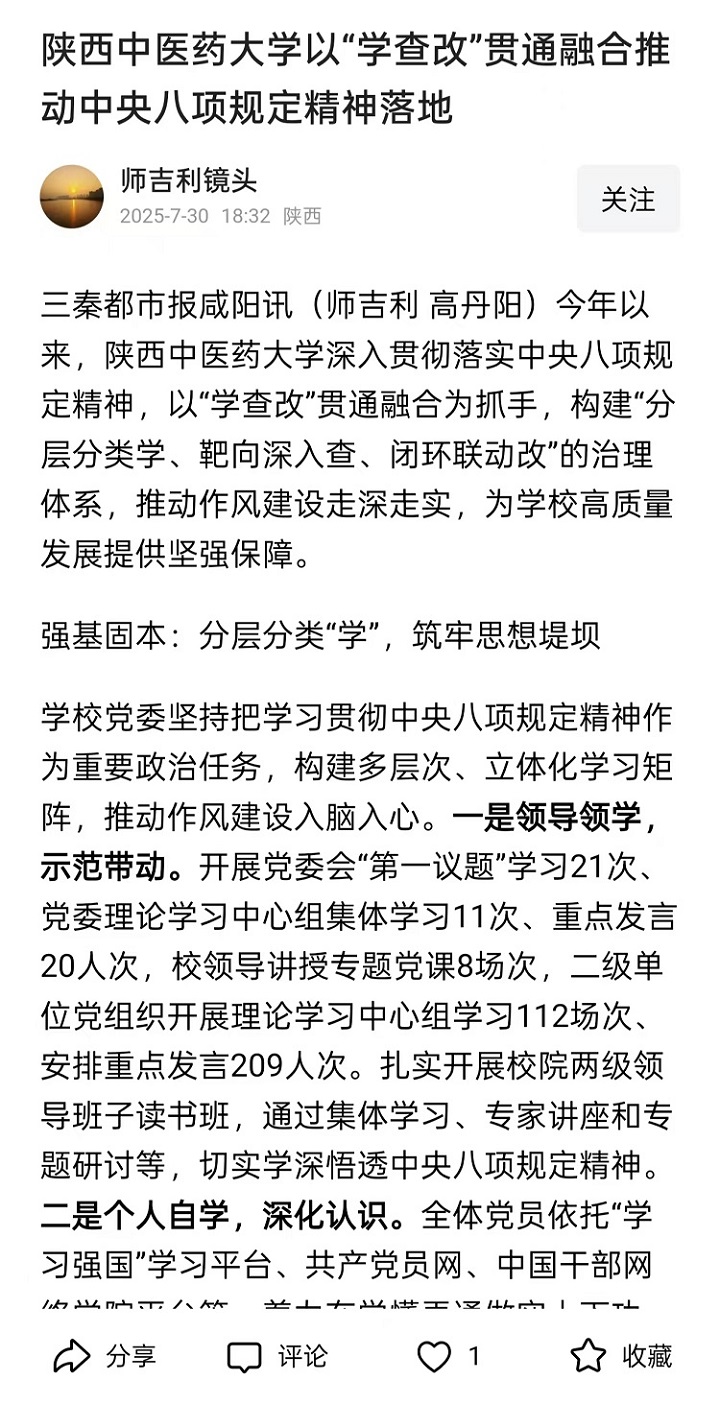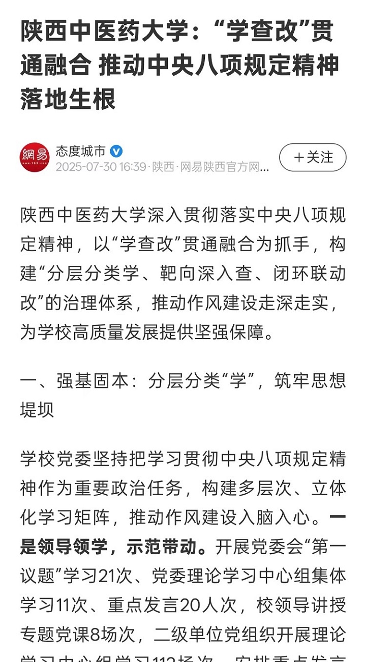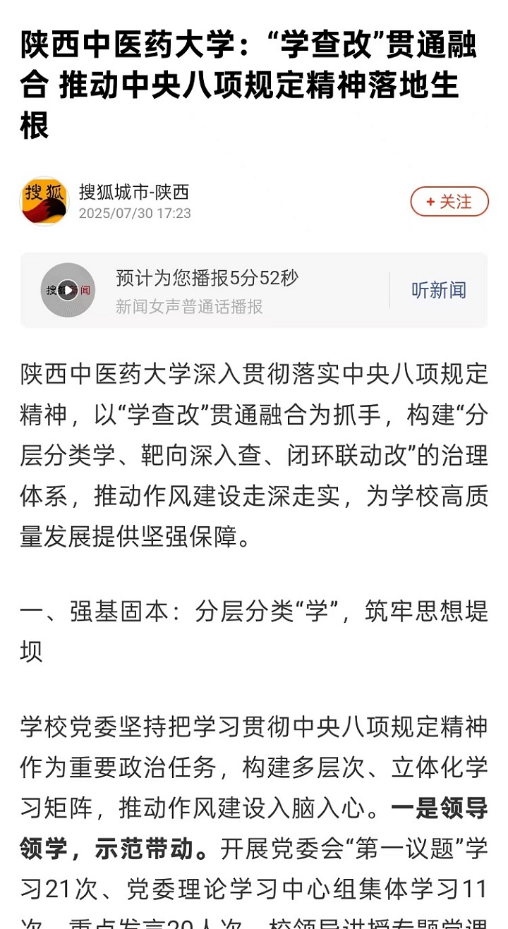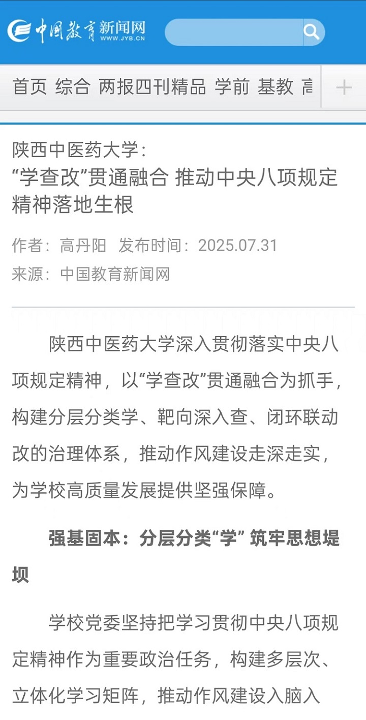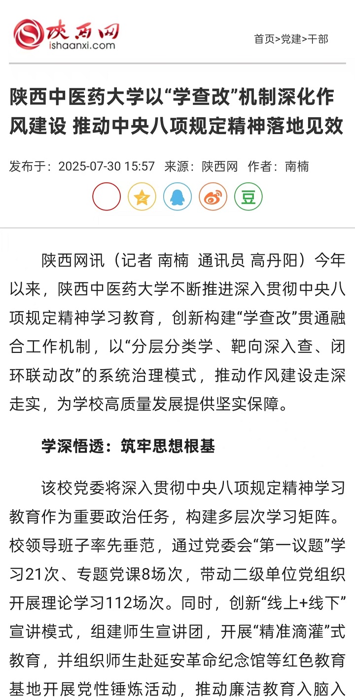 2025-07-30【中国教育新闻网、陕西网、搜狐、网易、今日头条】陕西中医药大学以“学查改”机制深化作风建设 推动中央八项规定精神落地见效