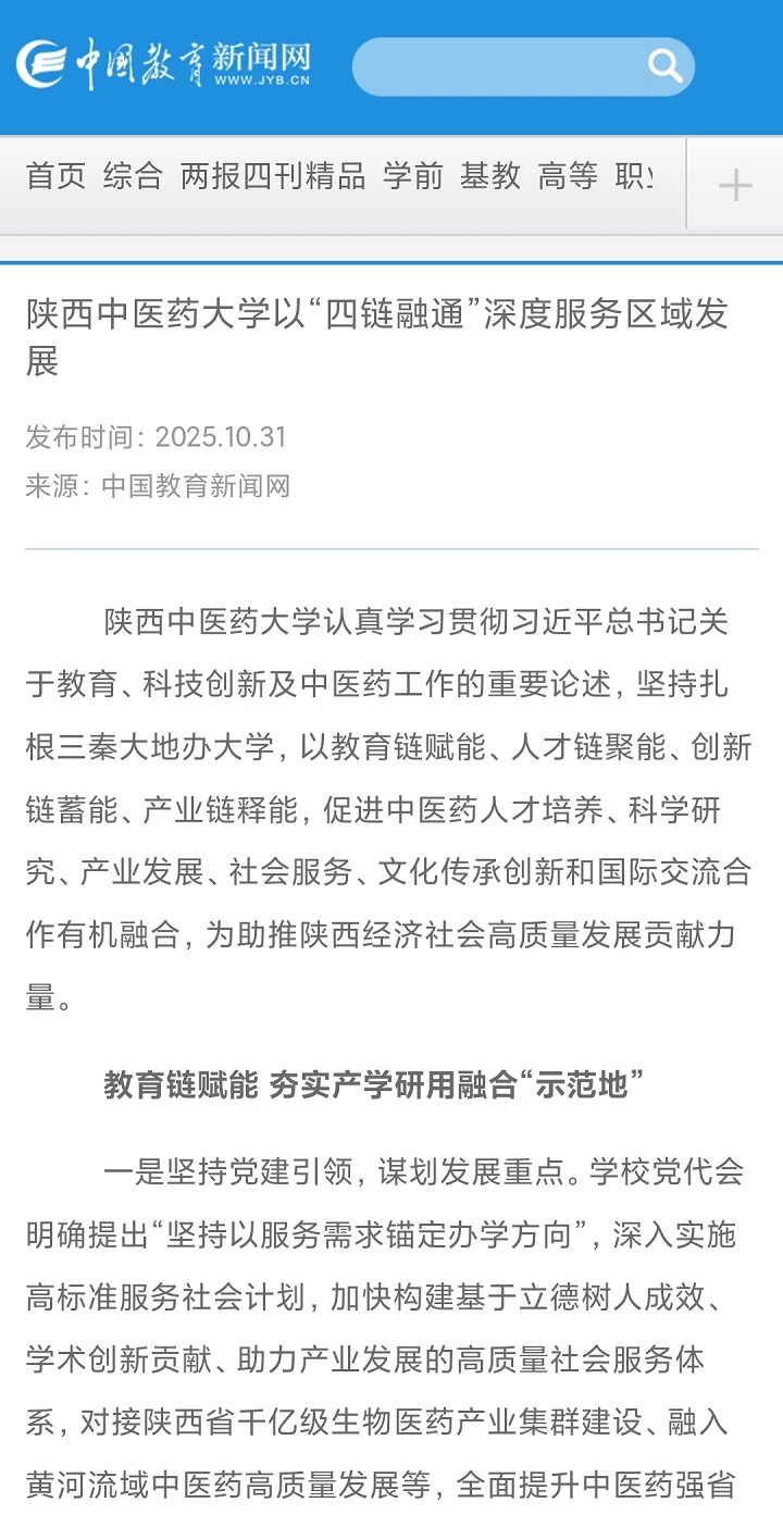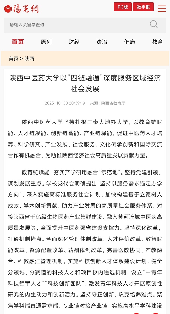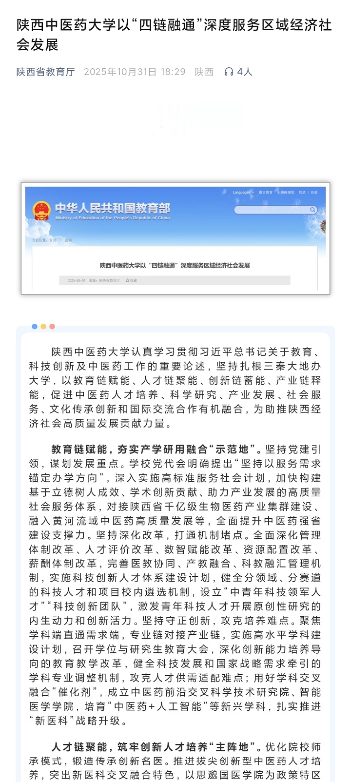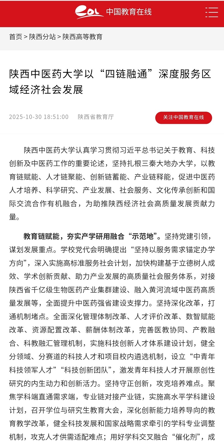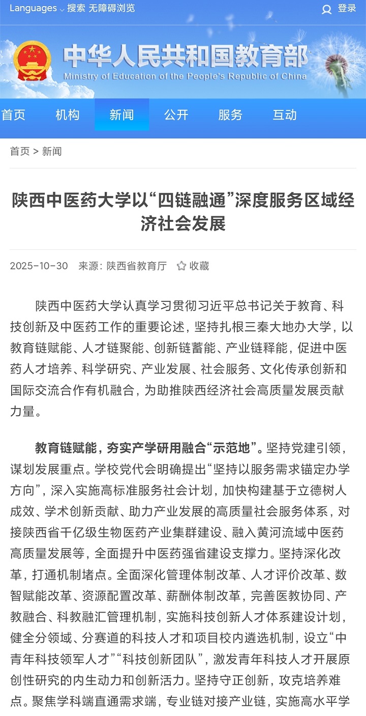 2025-10-30【教育部、中国教育在线、中国教育新闻网、中国中医药报、陕西省教育厅、光明网、阳光网、陕西网】陕西中医药大学以“四链融通”深度服务区域经济社会发展