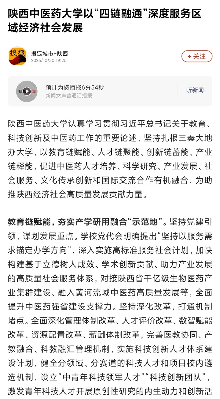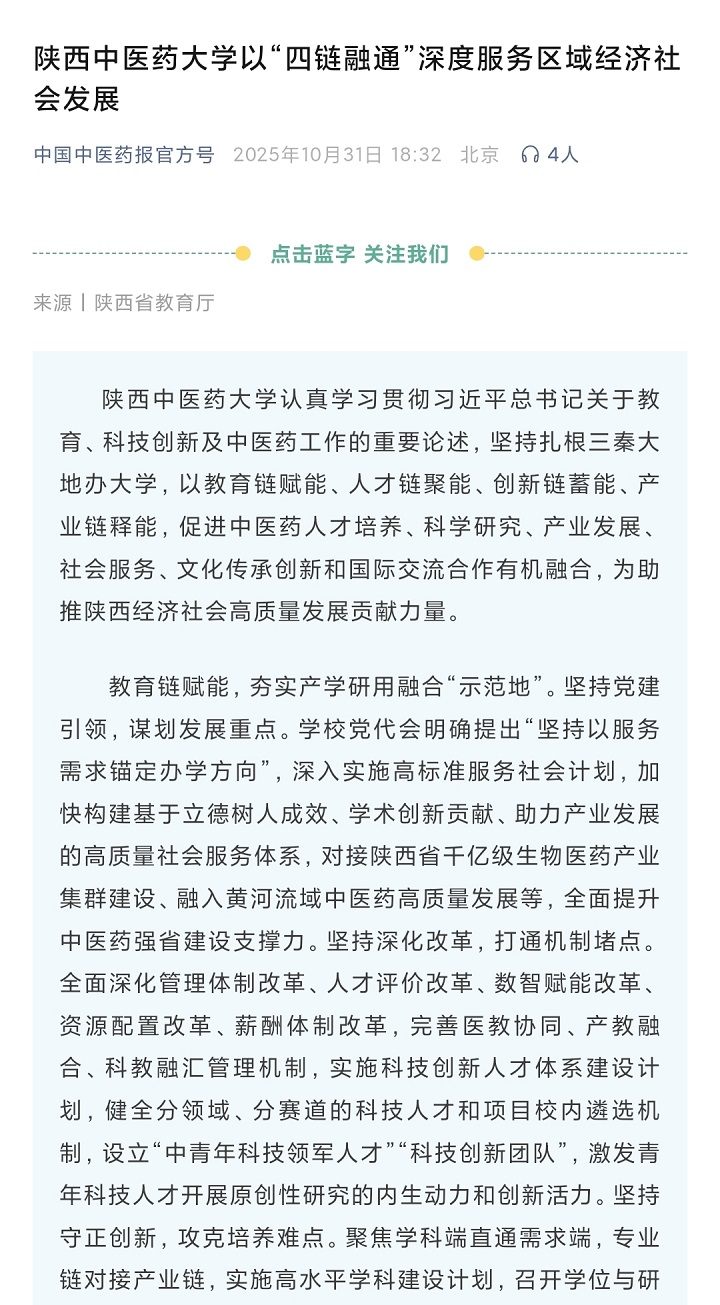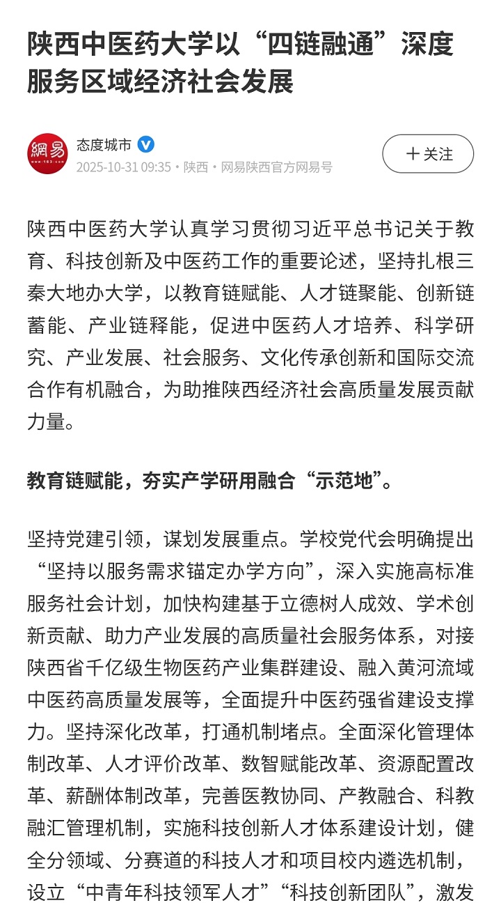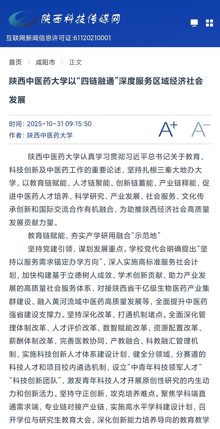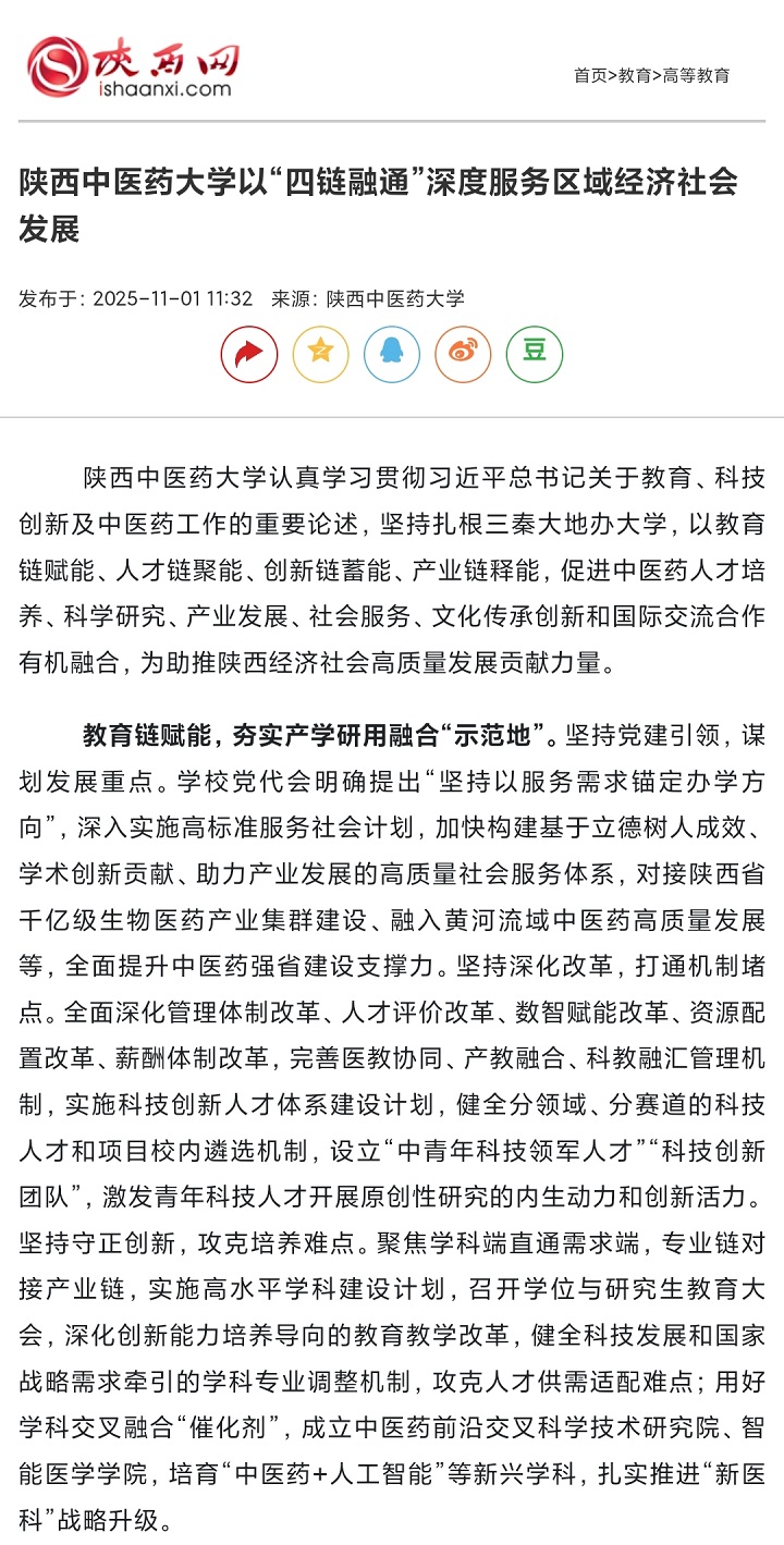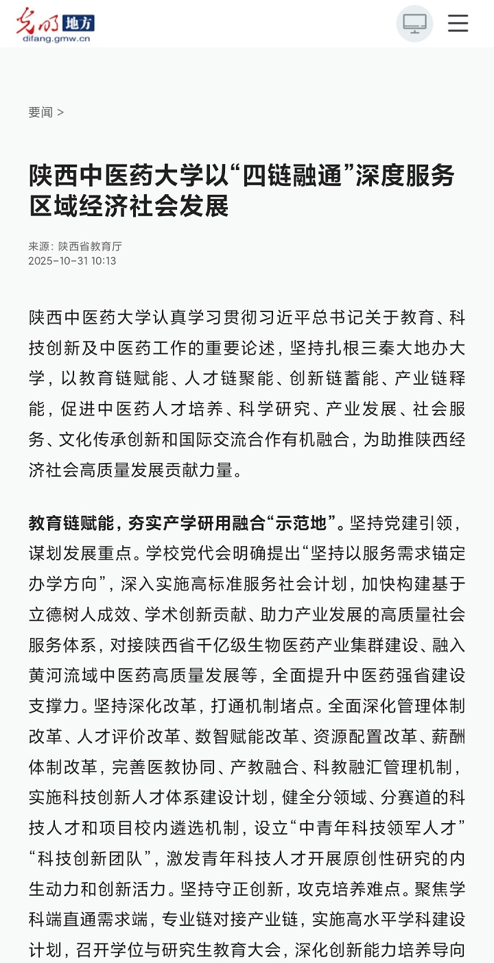 2025-10-30【教育部、中国教育在线、中国教育新闻网、中国中医药报、陕西省教育厅、光明网、阳光网、陕西网】陕西中医药大学以“四链融通”深度服务区域经济社会发展