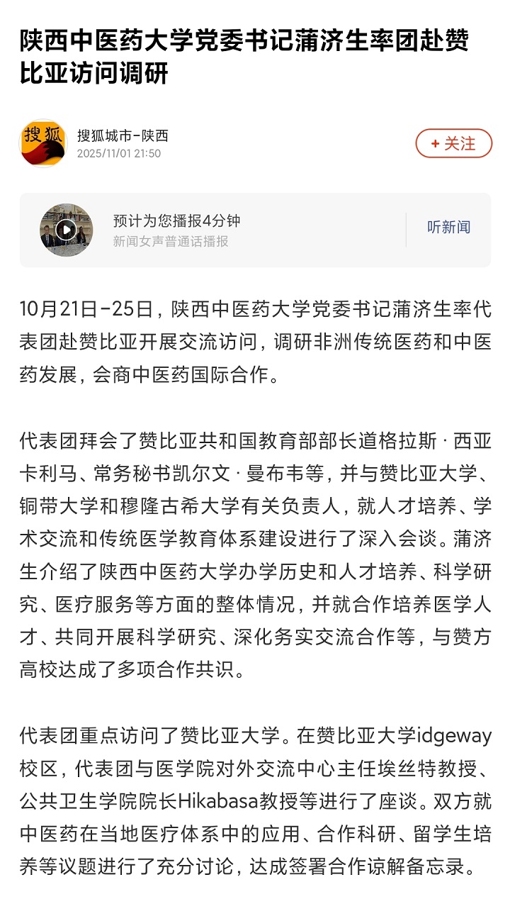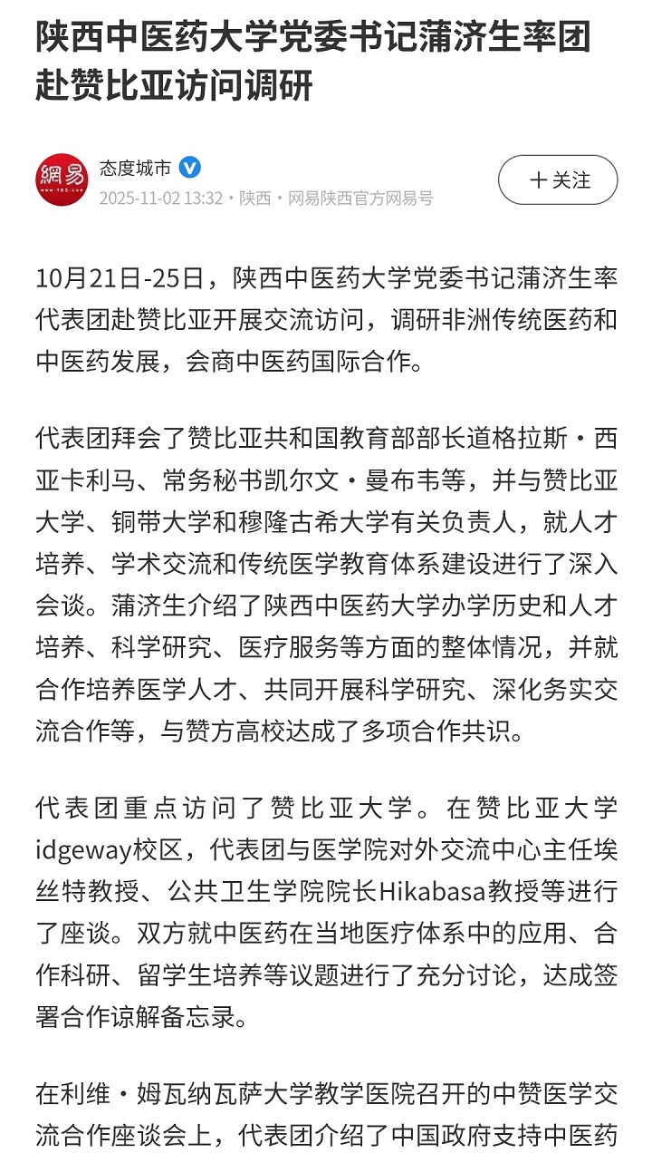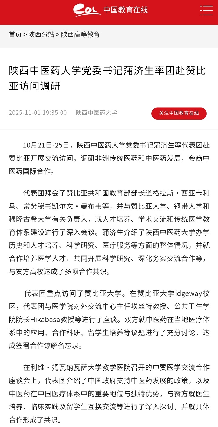 2025-11-01【中国教育在线、陕西科技传媒网、搜狐、网易】陕西中医药大学党委书记蒲济生率团赴赞比亚访问调研