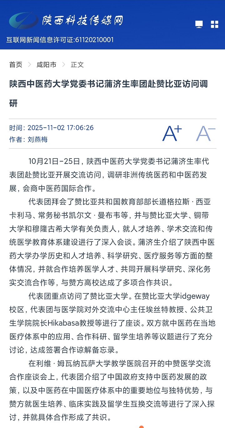 2.陕西中医药大学党委书记蒲济生率团赴赞比亚访问调研_陕西科技传媒网