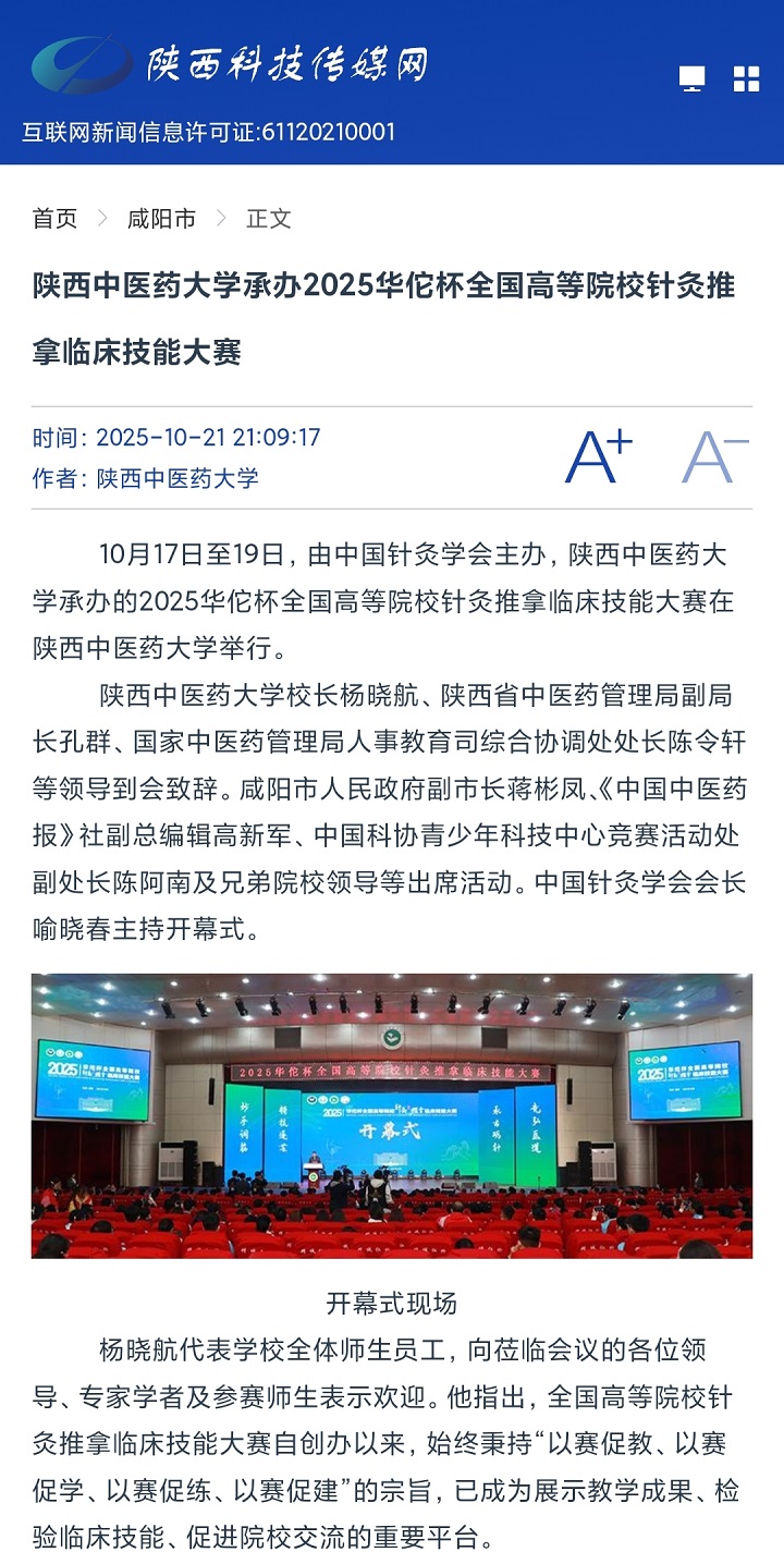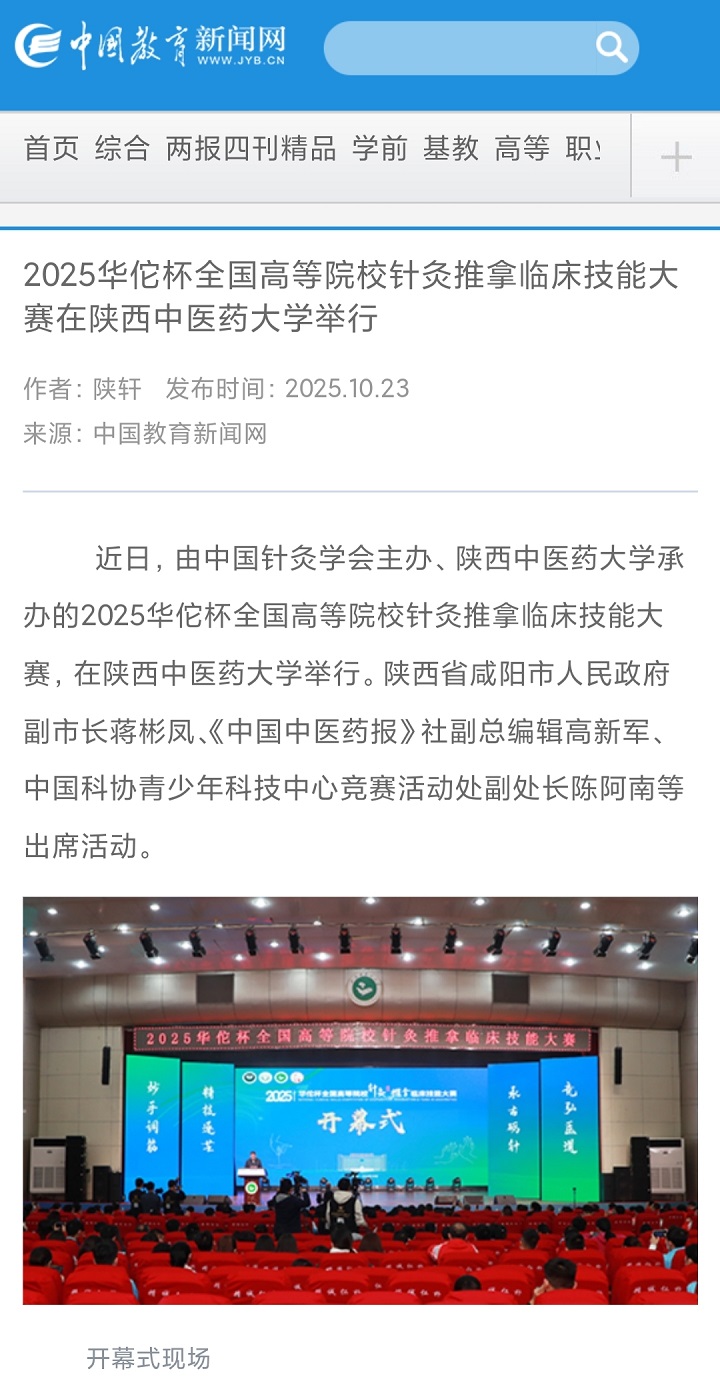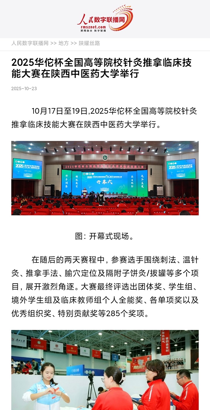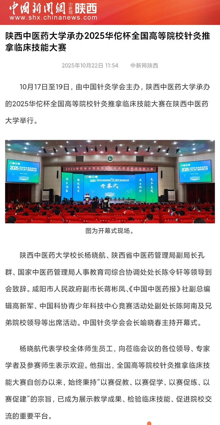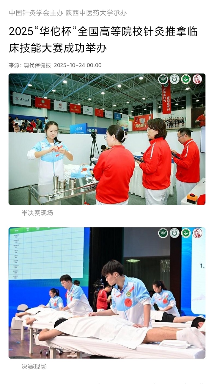 2025-10-22【中国新闻网、中国中医药报、中国教育新闻网、中国教育在线、人民数字联播网、现代保健报、陕西网】陕西中医药大学承办2025华佗杯全国高等院校针灸推拿临床技能大赛