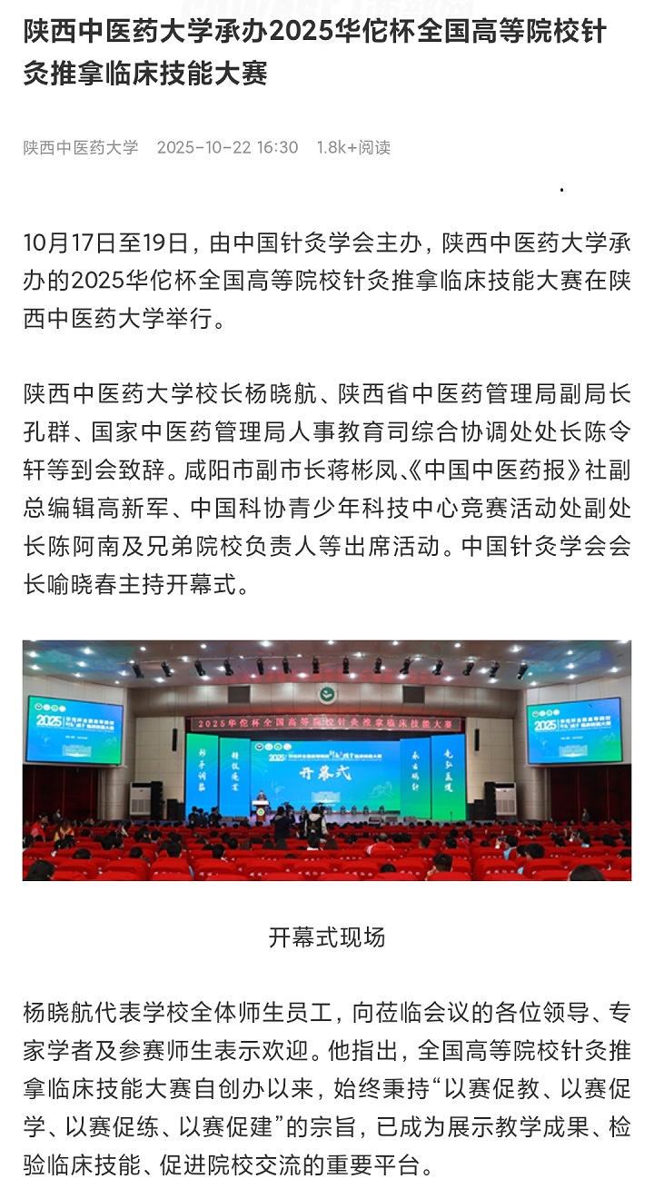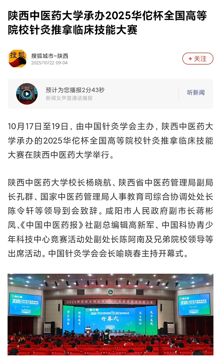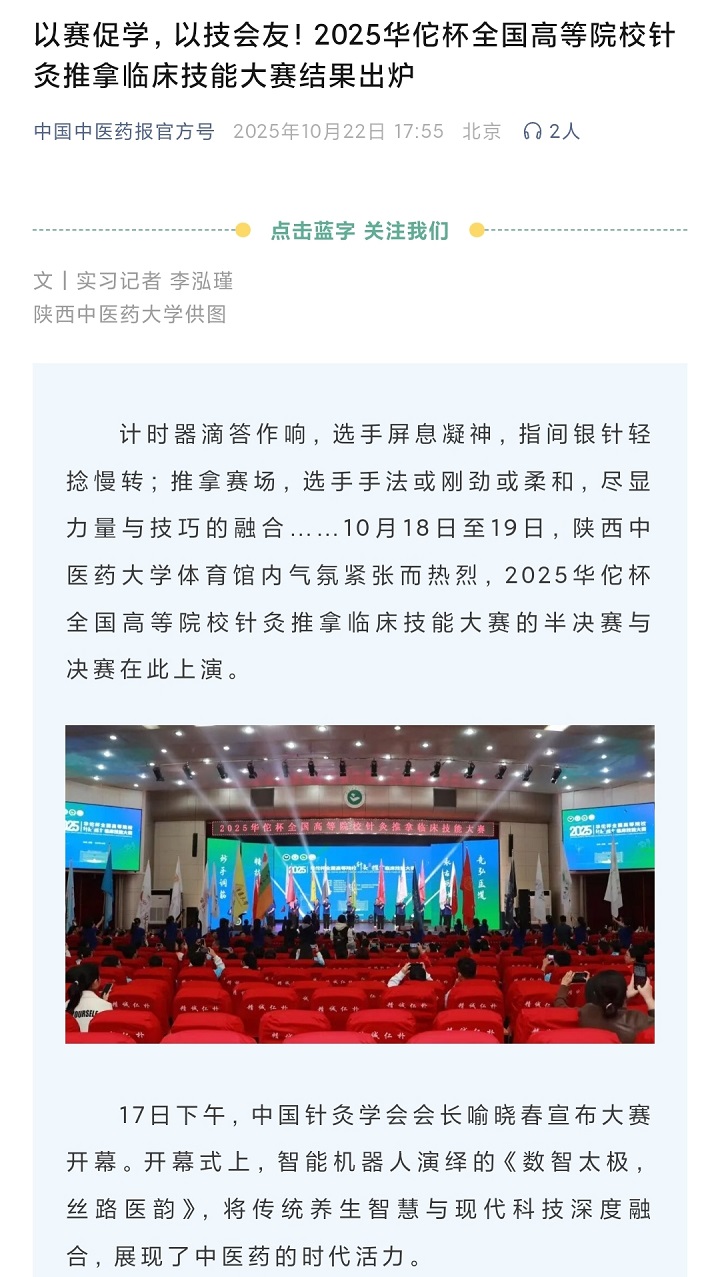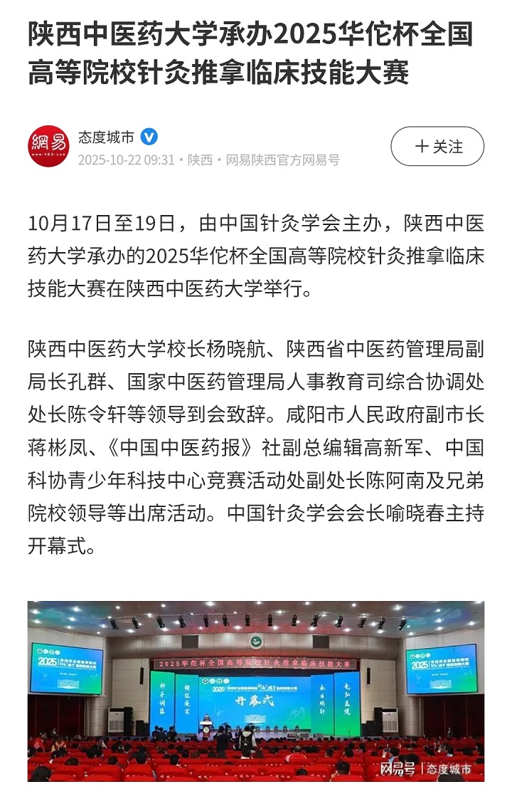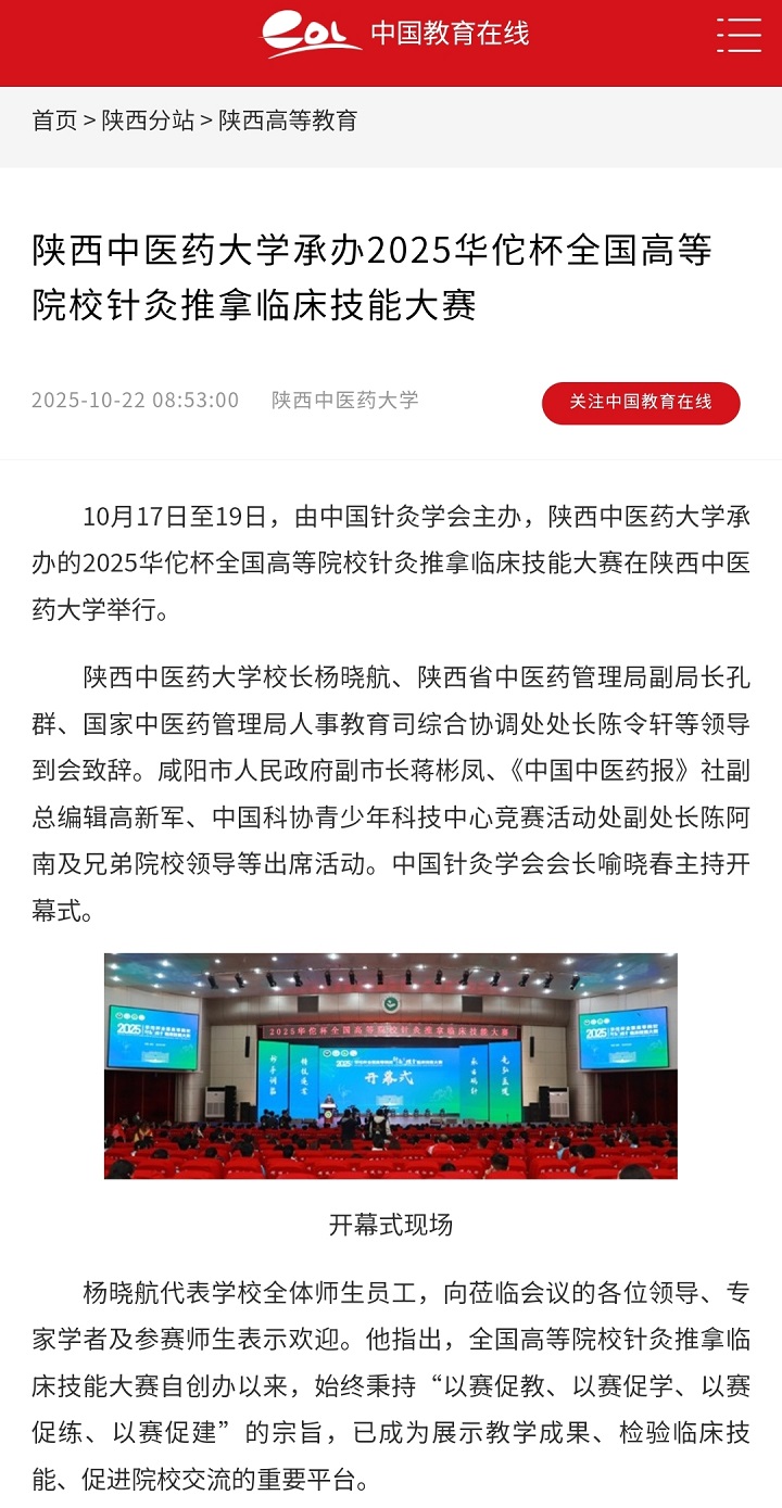 2025-10-22【中国新闻网、中国中医药报、中国教育新闻网、中国教育在线、人民数字联播网、现代保健报、陕西网】陕西中医药大学承办2025华佗杯全国高等院校针灸推拿临床技能大赛