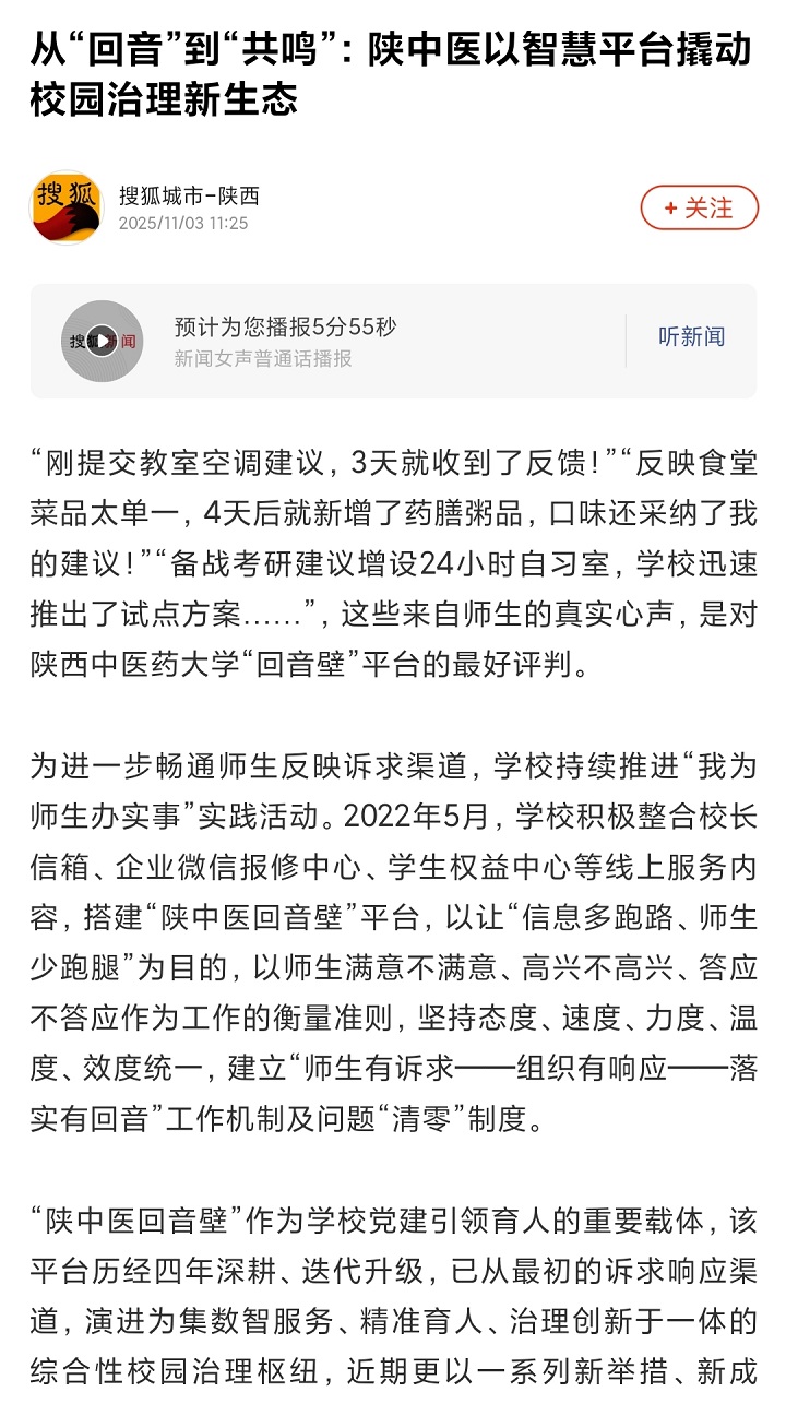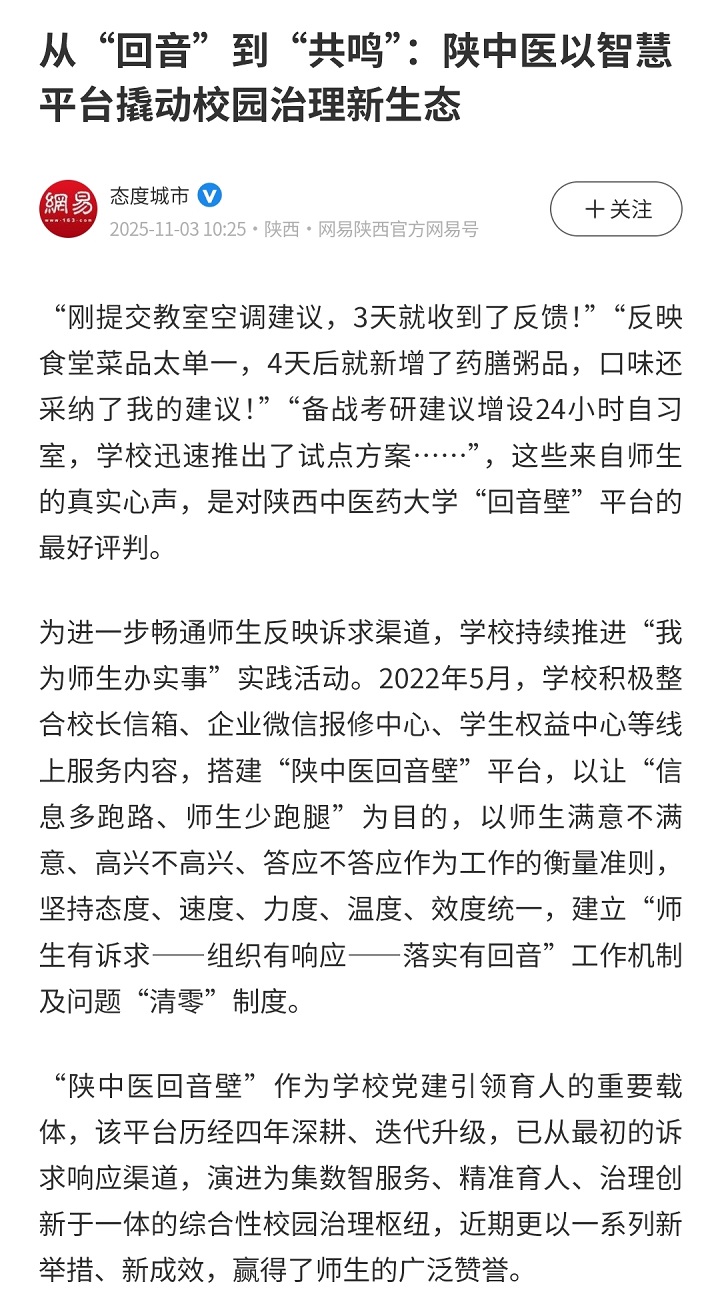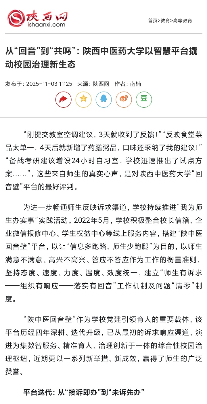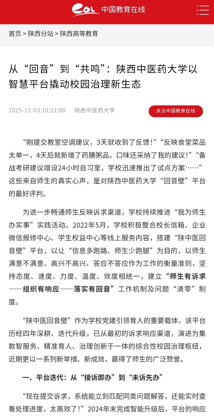 2025-11-03【中国教育在线、陕西网、搜狐、网易】从“回音”到“共鸣”:陕西中医药大学以智慧平台撬动校园治理新生态