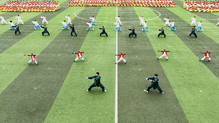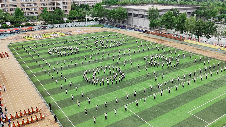随后,以“杏马奔腾新时代·岐黄逐梦正青春”为主题的大型团体操表演激扬开场。表演分为“薪火相传,杏林华章”与“绳舞绸扬,鼓振岐黄”两大篇章。离退休教职工通过合唱《少年》与模特走秀,尽显银发风采;功夫扇、五禽戏、太极拳等节目刚柔并济,彰显中华传统养生文化魅力;彩带龙翩跹起舞、花式跳绳灵动飞扬、中国鼓气势磅礴,点燃全场青春激情。尤其引人注目的是,6台智能机器人与师生同台演绎太极,实现了传统文化、中医药特色与现代科技的创新融合。最后,1200余名师生共同组成气势恢宏的主题画面,将开幕式氛围推向高潮。