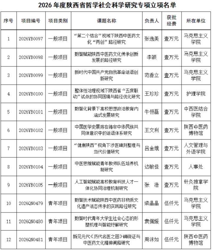 近日,陕西省社会科学界联合会公布了2026年度陕西省哲学社会科学研究专项一般项目、青年项目立项结果,我校9个一般项目,3个青年项目获批立项。