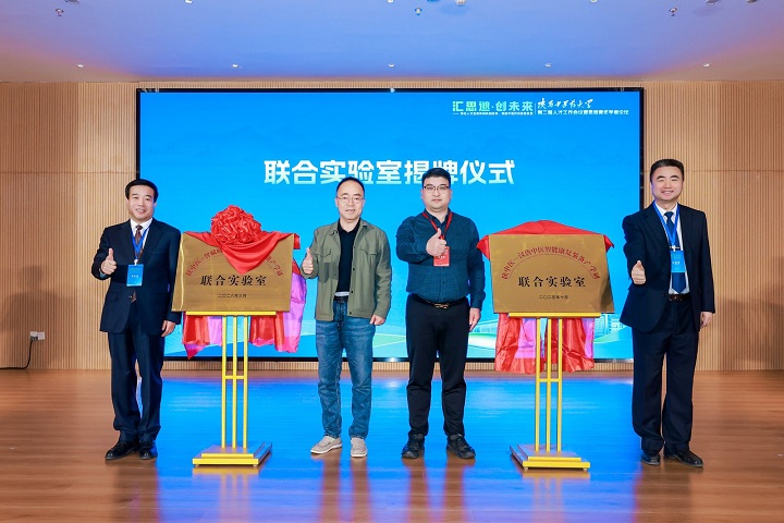 会上,蒲济生、杨晓航为五位专家学者颁发了特聘教授聘书,并代表学校与陕西汉唐计算机有限责任公司董事长杨建新,天津智赋岐黄医疗科技有限公司创始人、董事长李坤共同为联合实验室揭牌。
